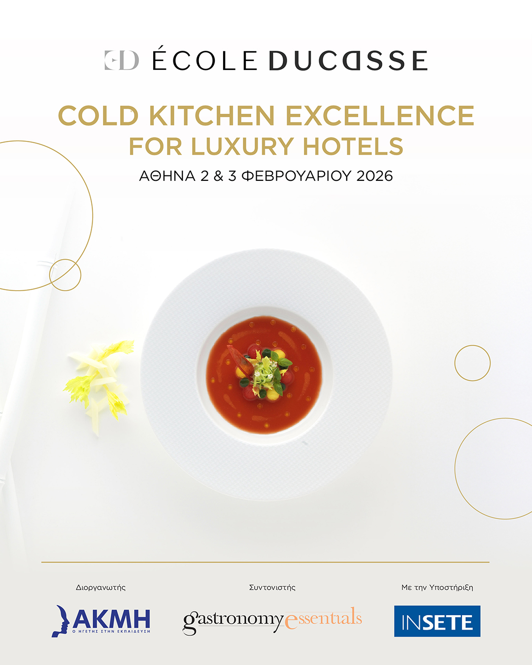 Το ΙΕΚ ΑΚΜΗ και η Gastronomy Essentials παρουσιάζουν ένα εξειδικευμένο διήμερο πρόγραμμα αφιερωμένο στην υψηλή τέχνη της Κρύας Κουζίνας, σε συνεργασία με την παγκοσμίου φήμης Ecole Ducasse. Με εισηγητή τον έμπειρο Γάλλο Executive Chef Julian Mercier, Διευθυντή εκπαίδευσης της σχολής, το πρόγραμμα εστιάζει στις σύγχρονες τεχνικές, τις απαιτήσεις και τα standards που συναντώνται σήμερα σε 5* ξενοδοχεία, resorts και fine dining επιχειρήσεις.