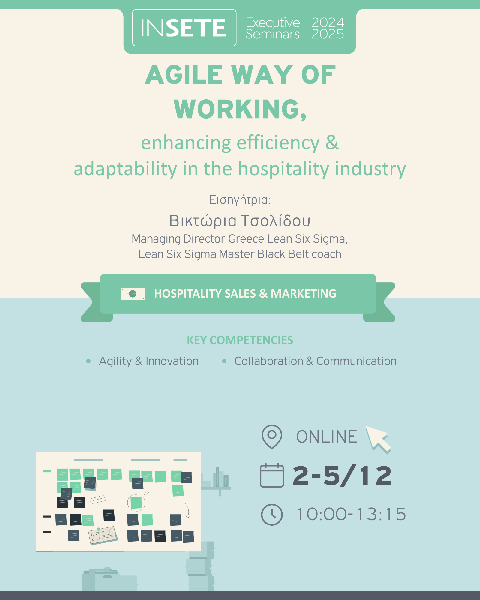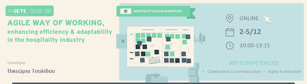 Το εκπαιδευτικό πρόγραμμα «AGILE WAY OF WORKING, enhancing efficiency & adaptability in the hospitality industry» είναι σχεδιασμένο για να βοηθήσει τους επαγγελματίες της φιλοξενίας να ενσωματώσουν τις αρχές του Agile στις επιχειρήσεις τους. Οι συμμετέχοντες θα μάθουν πώς να βελτιώνουν την αποδοτικότητα των διαδικασιών, να προσαρμόζονται γρήγορα στις αλλαγές και να ενισχύουν την ικανοποίηση των πελατών. Το πρόγραμμα καλύπτει τις βασικές αρχές του Agile, τη χρήση μεθοδολογιών όπως Scrum και Kanban, και την εφαρμογή τους σε πραγματικά σενάρια της φιλοξενίας. Μέσα από διαδραστικές συνεδρίες και πρακτικές ασκήσεις, οι συμμετέχοντες θα αποκτήσουν τις δεξιότητες που χρειάζονται για να δημιουργήσουν ευέλικτες, αποδοτικές και πελατοκεντρικές διαδικασίες στις επιχειρήσεις τους.
