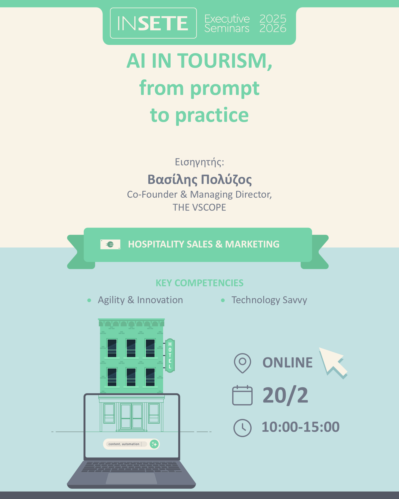 Το σεμινάριο απευθύνεται σε ιδιοκτήτες τουριστικών επιχειρήσεων, στελέχη marketing, digital managers και επαγγελματίες της φιλοξενίας που θέλουν να κατανοήσουν πρακτικά πώς μπορούν να αξιοποιήσουν την Τεχνητή Νοημοσύνη στην καθημερινή τους δραστηριότητα, χωρίς να απαιτούνται τεχνικές γνώσεις ή προηγούμενη επαφή με AI εργαλεία.