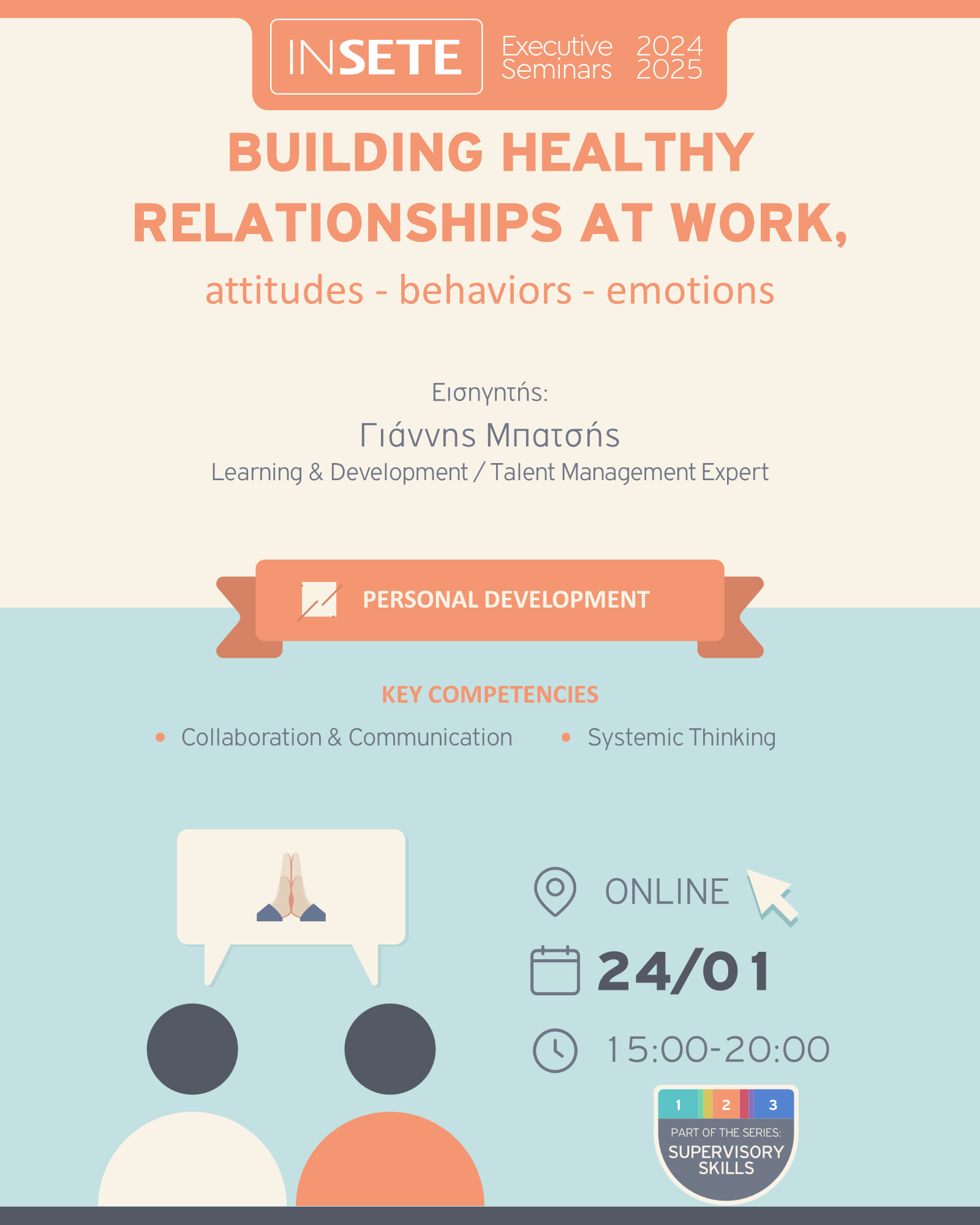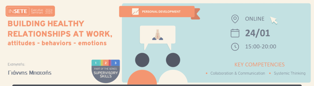 Η σειρά σεμιναρίων SUPERVISORY SKILLS αποτελείται από 4 εκπαιδεύσεις που είναι χρήσιμες για όλους, ειδικά για όσους θέλουν να ενισχύσουν τις δεξιότητες τους. Με θεματολογία που κυμαίνεται από την αποτελεσματική επικοινωνία και την παρακίνηση της ομάδας μέχρι την προώθηση μιας θετικής εργασιακής κουλτούρας, τα σεμινάριο αυτά έχουν σκοπό να αναβαθμίσουν τις ηγετικές σας ικανότητες και να προωθήσουν ουσιαστικές αλλαγές στην ομάδα σας. Μπορείτε να παρακολουθήσετε όλη τη σειρά ή μεμονωμένα όποιο από τα 4 χρειάζεστε.