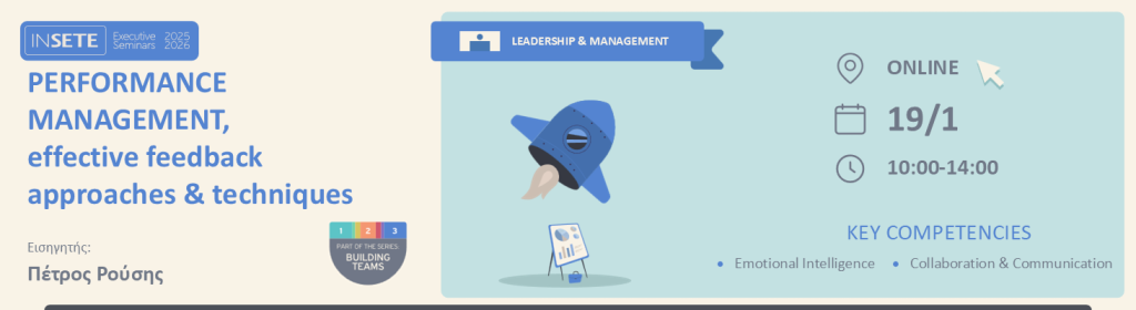 Το εκπαιδευτικό πρόγραμμα «Performance Management, Effective Feedback approaches and techniques» είναι ένα έντονα διαδραστικό, περιεκτικό πρόγραμμα σκοπός του οποίου είναι να βοηθήσει τους συμμετέχοντες στην μεθοδευμένη ανάπτυξη του προσωπικού τους με την αξιοποίηση οργανωμένων επίσημων ή άτυπων συστημάτων.