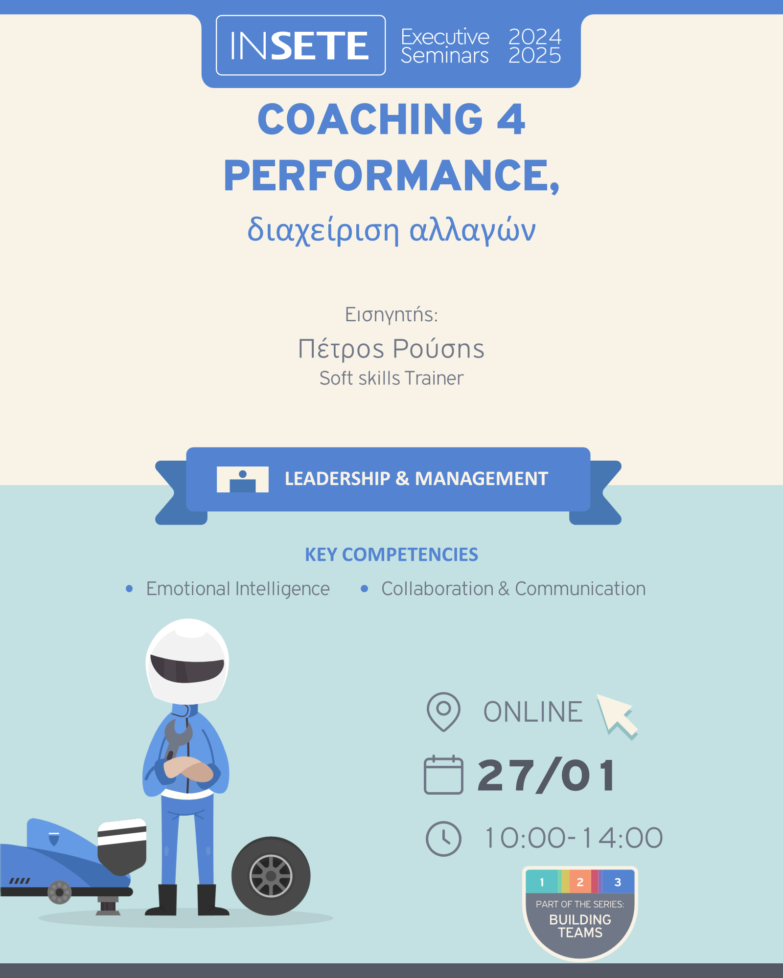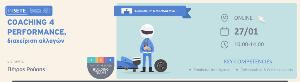 Το εκπαιδευτικό πρόγραμμα “Coaching 4 Performance, Διαχείριση Αλλαγών” είναι ένα έντονα διαδραστικό, επικεντρωμένο πρόγραμμα, σκοπός του οποίου είναι η ανάπτυξη δεξιοτήτων στο κατευθυντικό Coaching και την αποτελεσματική διαχείριση Αλλαγών.