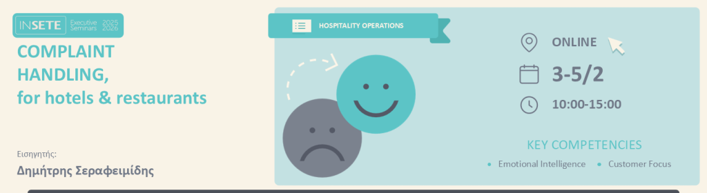 Όσοι συμμετάσχετε στο “COMPLAINT HANDLING, for Hotels and Restaurants” θα καταλάβετε γιατί και πώς θα βγαίνετε ΠΑΝΤΑ κερδισμένοι! Και εσείς προσωπικά και η επιχείρησή σας!