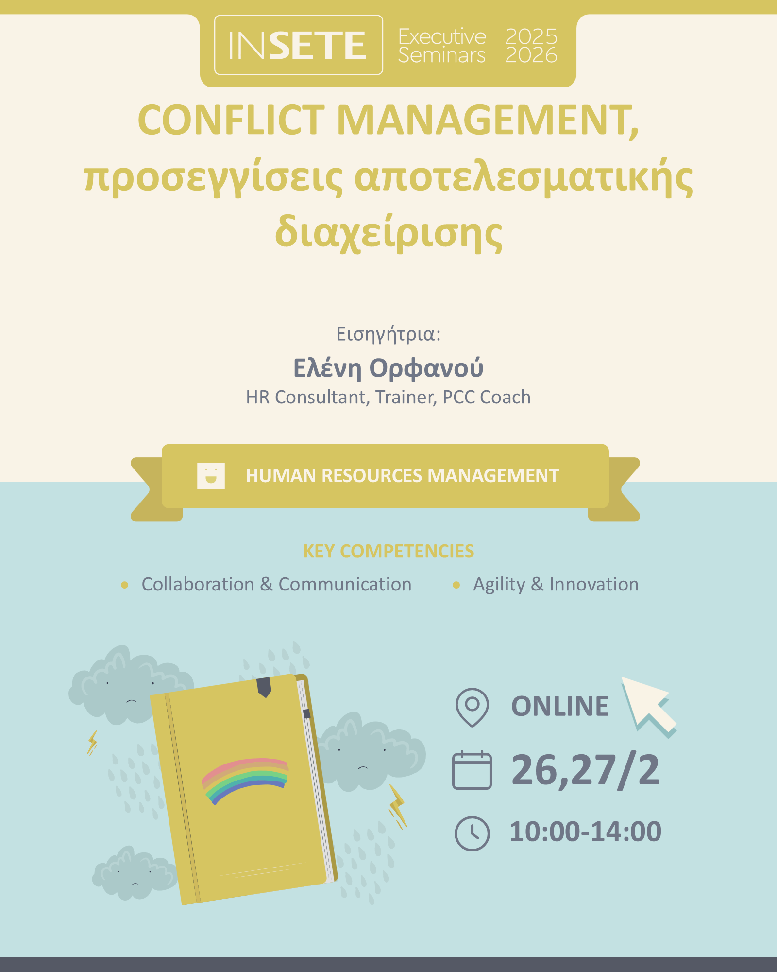 Το εκπαιδευτικό πρόγραμμα «CONFLICT MANAGEMENT, προσεγγίσεις αποτελεσματικής διαχείρισης» έχει στόχο να βοηθήσει τους συμμετέχοντες να αναπτύξουν γνώσεις και δεξιότητες που απαιτούνται για την αποτελεσματική διαχείριση συγκρούσεων στο χώρο εργασίας. Οι συμμετέχοντες θα εξοικειωθούν με τις αιτίες, τα είδη και τις φάσεις σύγκρουσης. Θα γνωρίσουν διαφορετικές προσεγγίσεις αντιμετώπισης των συγκρούσεων, ανάλογα με τις συνθήκες και το στόχο. Θα εξοικειωθούν με τη διαδικασία επίλυσης συγκρούσεων και θα κατανοήσουν το ρόλο του ηγέτη ομάδας στην αποτελεσματική διαχείριση των συγκρούσεων εντός ομάδας. Οι συμμετέχοντες στα πλαίσια του προγράμματος θα έχουν την ευκαιρία να καταρτίσουν ατομικό πλάνο δράσης που θα περιλαμβάνει ενέργειες που θα κάνουν προκειμένου να παρακινούν αποτελεσματικά τους ανθρώπους τους.