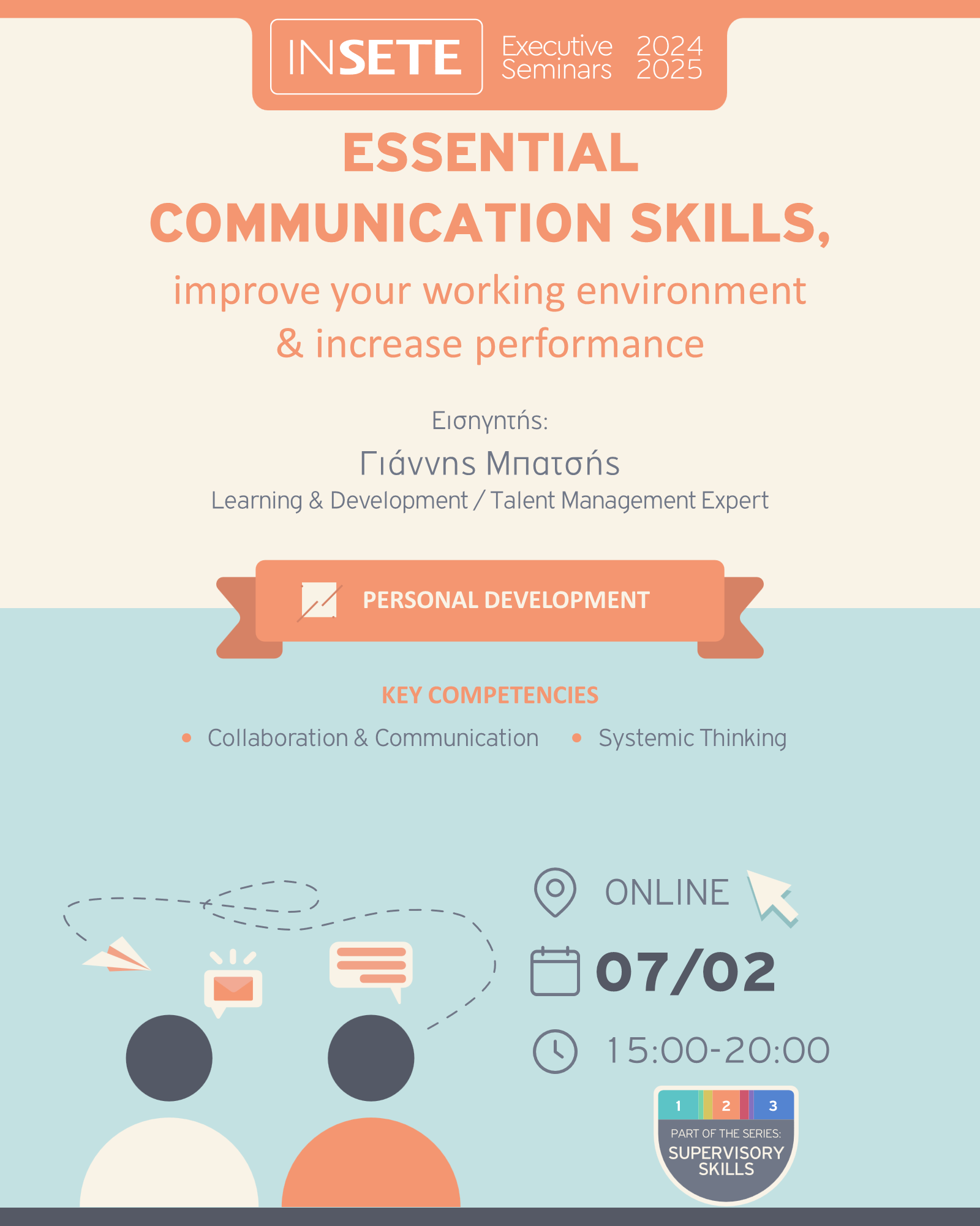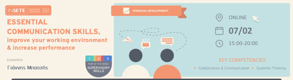 Η σειρά σεμιναρίων SUPERVISORY SKILLS αποτελείται από 4 εκπαιδεύσεις που είναι χρήσιμες για όλους, ειδικά για όσους θέλουν να ενισχύσουν τις δεξιότητες τους. Με θεματολογία που κυμαίνεται από την αποτελεσματική επικοινωνία και την παρακίνηση της ομάδας μέχρι την προώθηση μιας θετικής εργασιακής κουλτούρας, τα σεμινάριο αυτά έχουν σκοπό να αναβαθμίσουν τις ηγετικές σας ικανότητες και να προωθήσουν ουσιαστικές αλλαγές στην ομάδα σας. Μπορείτε να παρακολουθήσετε όλη τη σειρά ή μεμονωμένα όποιο από τα 4 χρειάζεστε.