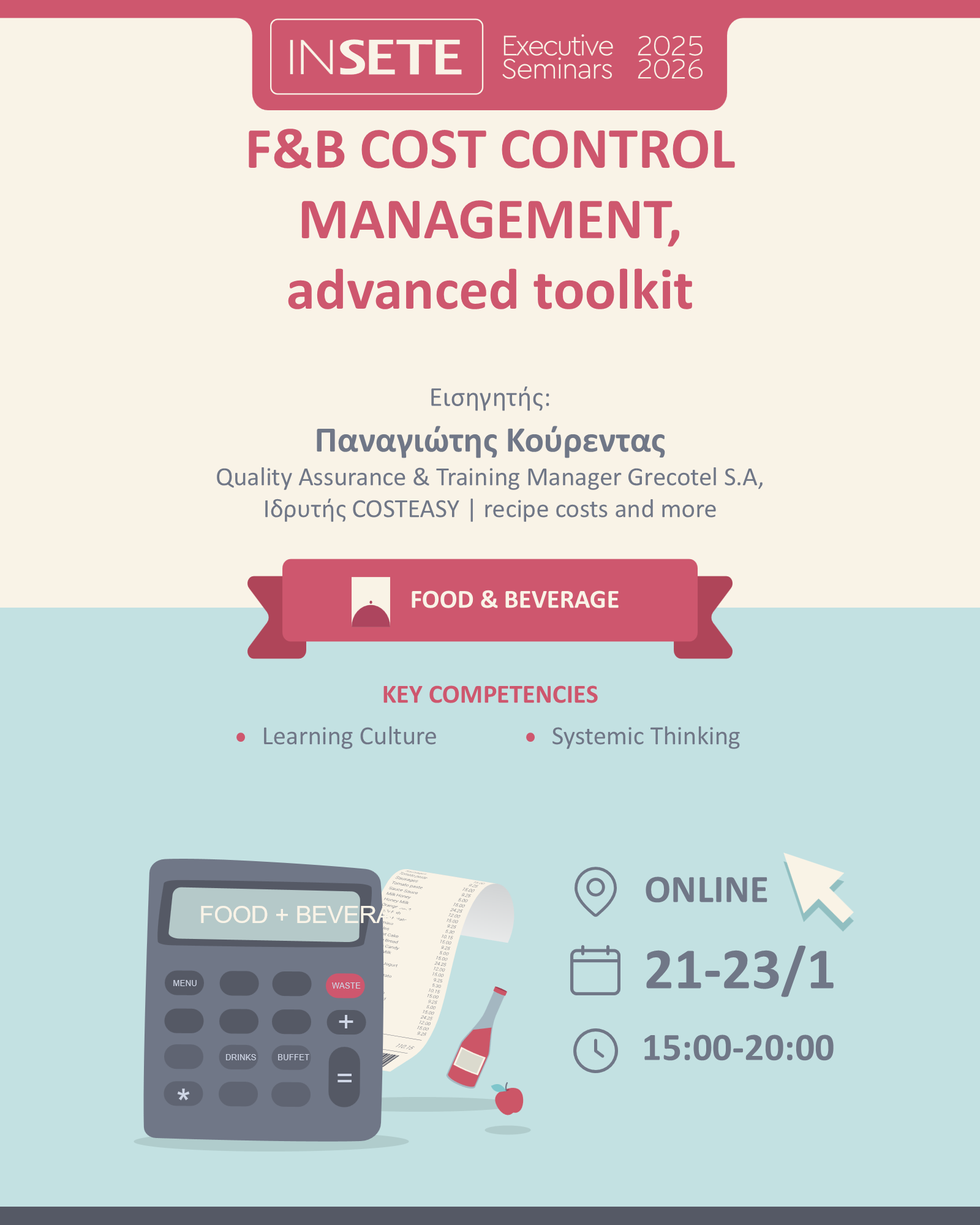 Το Executive Seminar “ F&B COST CONTROL MANAGEMENT, advanced toolkit” επικεντρώνεται στις αρχές και στις διαδικασίες που απαιτούνται για ένα αποτελεσματικό σύστημα υπολογισμού και ελέγχου του κόστους.