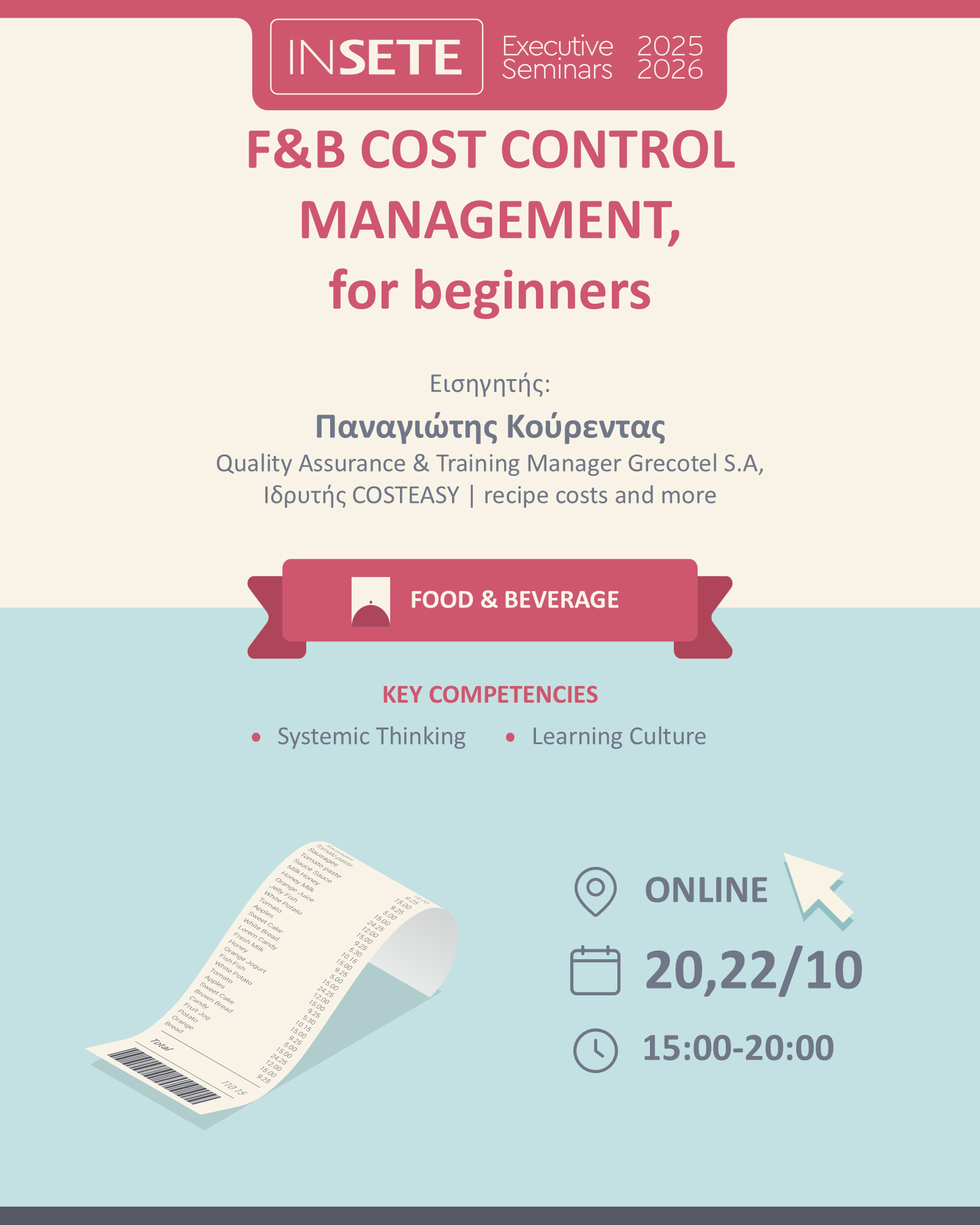 Το εκπαιδευτικό πρόγραμμα “F&B COST CONTROL MANAGEMENT, for beginners” έχει σχεδιαστεί για να παρέχει μια πρακτική και ολοκληρωμένη εισαγωγή στις θεμελιώδεις αρχές του ελέγχου και της διαχείρισης του κόστους σε επιχειρήσεις εστίασης και φιλοξενίας.