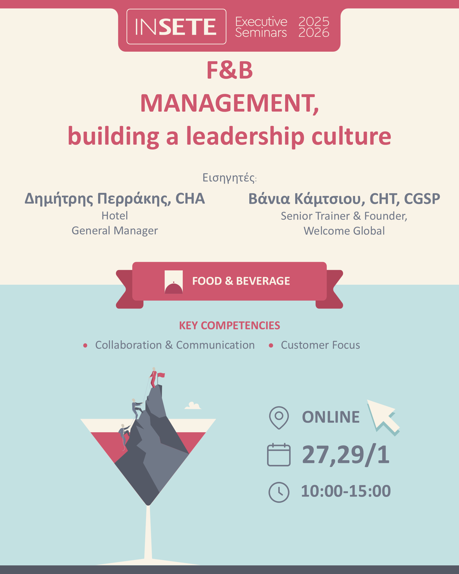 Το Executive Seminar «F&B MANAGEMENT, building a leadership culture» επικεντρώνεται σε δύο βασικούς άξονες κατάρτισης: Ο πρώτος άξονας είναι να δούμε το ρόλο του ηγέτη στη λειτουργία του επισιτιστικού τμήματος ενός καταλύματος ή μιας επιχείρησης εστίασης. Ο δεύτερος άξονας είναι να δούμε τα ‘εργαλεία’ που διαθέτει ο ηγέτης, για την αποτελεσματική διαχείριση του ανθρώπινου παράγοντα (πελάτη και συνεργάτη).