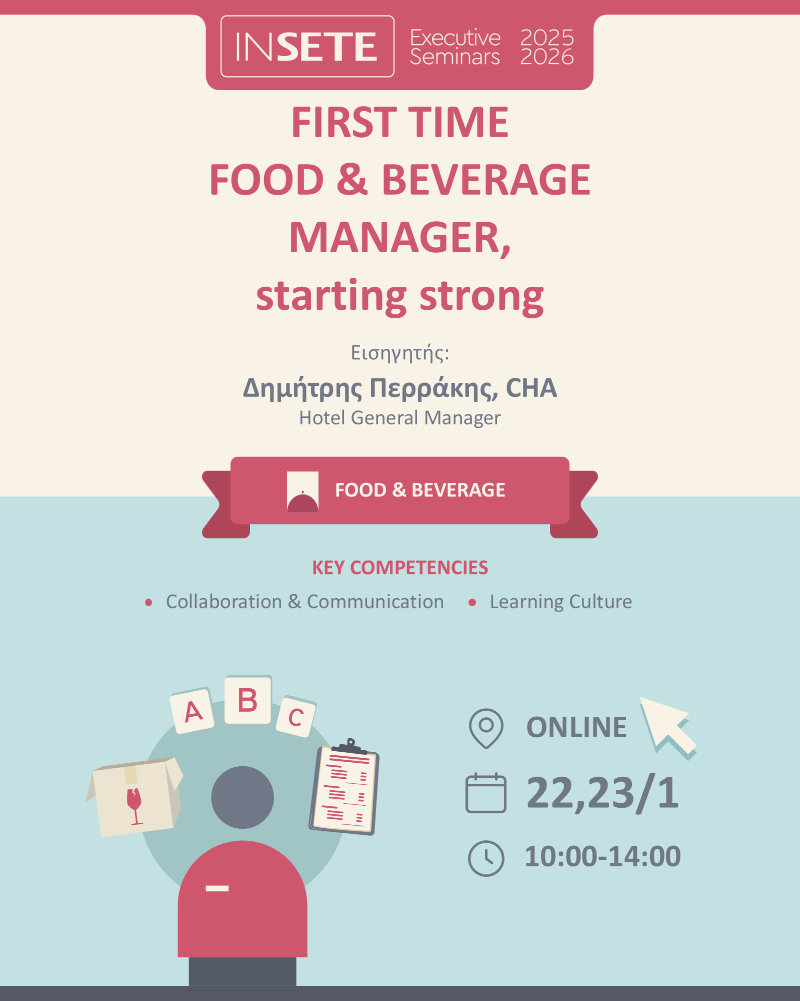 Το Executive Seminar «FIRST TIME FOOD & BEVERAGE MANAGER, starting strong» είναι ένα σεμινάριο το οποίο με θεωρητικό αλλά και πρακτικό τρόπο εξηγεί πως μπορεί ένα άτομο με λειτουργική εμπειρία σε τμήματα F&B να μεταβεί σε διοικητική θέση και να αναλάβει καθήκοντα F&B Manager σε μικρές, μεσαίες ή μεγάλες επισιτιστικές μονάδες.