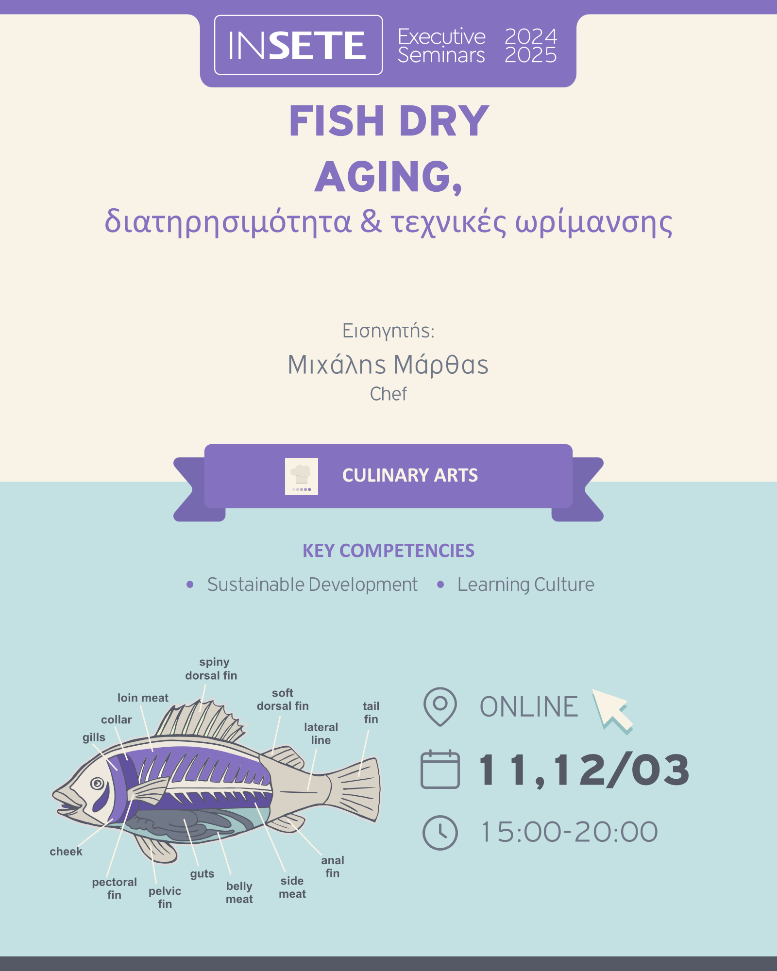 Στις 11 και 12 Μαρτίου 2025, το ΙΝΣΕΤΕ και η Gastronomy Essentials παρουσιάζουν ένα εξειδικευμένο διήμερο webinar, με εισηγητή τον chef Μιχάλη Μάρθα, αφιερωμένο στην τέχνη του Fish Dry Aging. Το πρόγραμμα επικεντρώνεται στη διατήρηση, ωρίμανση και αλλαντοποίηση του ψαριού, δίνοντας έμφαση στη βιώσιμη και ολοκληρωτική αξιοποίησή του.