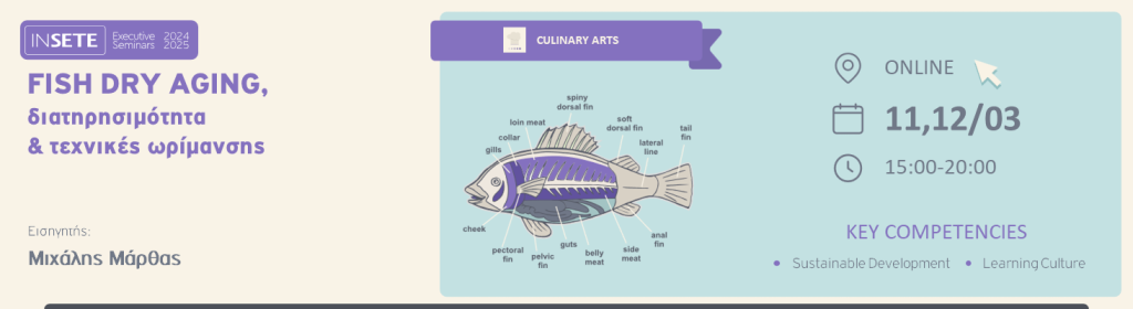 Στις 11 και 12 Μαρτίου 2025, το ΙΝΣΕΤΕ και η Gastronomy Essentials παρουσιάζουν ένα εξειδικευμένο διήμερο webinar, με εισηγητή τον chef Μιχάλη Μάρθα, αφιερωμένο στην τέχνη του Fish Dry Aging. Το πρόγραμμα επικεντρώνεται στη διατήρηση, ωρίμανση και αλλαντοποίηση του ψαριού, δίνοντας έμφαση στη βιώσιμη και ολοκληρωτική αξιοποίησή του.