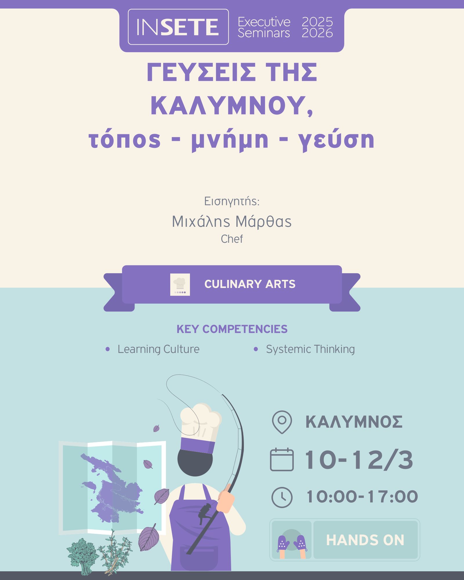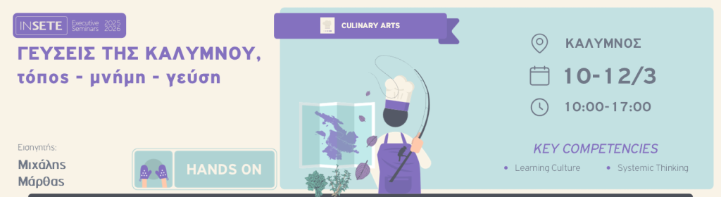Το πρόγραμμα «ΓΕΥΣΕΙΣ ΤΗΣ ΚΑΛΥΜΝΟΥ: ΤΟΠΟΣ, ΜΝΗΜΗ, ΓΕΥΣΗ» αποτελεί μια κατάδυση στη γαστρονομική ταυτότητα του νησιού. Τα άτομα που θα συμμετάσχουν θα αναζητήσουν, θα αγγίξουν, θα δοκιμάσουν και θα δημιουργήσουν με υλικά που συνδέονται βαθιά με τη μνήμη του τόπου – από τα άγρια βότανα των βουνών μέχρι τους θησαυρούς της θάλασσας. Κάθε γεύση θα αφηγείται μια ιστορία. Κάθε συνταγή θα μεταμορφώνεται σε εμπειρία.