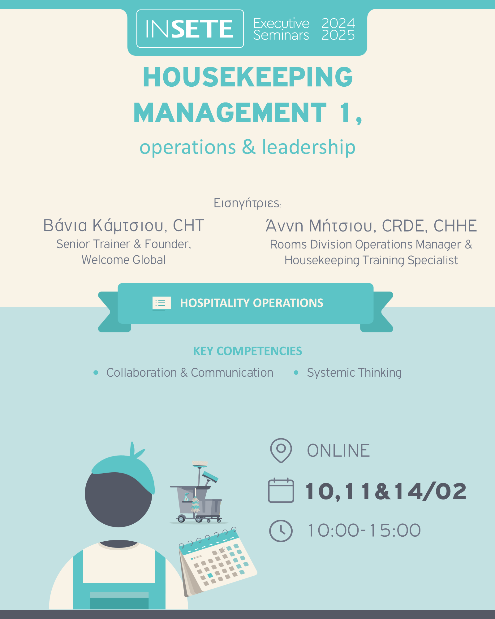 Το Executive Seminar «HOUSEKEEPING MANAGEMENT 1, Operations & Leadership» επικεντρώνεται σε δύο τομείς: στον λειτουργικό τομέα (Operations, πρότυπα λειτουργίας) και στον τομέα διοίκησης και ηγεσίας, με τα δύο αυτά κομμάτια να είναι αλληλένδετα και εξίσου σημαντικά για την επιτυχία και την επίτευξη των στόχων του τμήματος και της επιχείρησης.