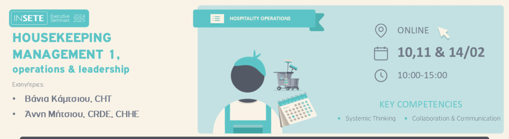 Το Executive Seminar «HOUSEKEEPING MANAGEMENT 1, Operations & Leadership» επικεντρώνεται σε δύο τομείς: στον λειτουργικό τομέα (Operations, πρότυπα λειτουργίας) και στον τομέα διοίκησης και ηγεσίας, με τα δύο αυτά κομμάτια να είναι αλληλένδετα και εξίσου σημαντικά για την επιτυχία και την επίτευξη των στόχων του τμήματος και της επιχείρησης.
