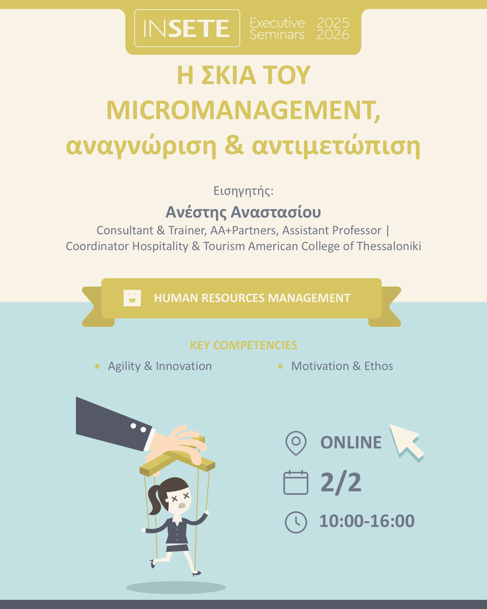 Το πρόγραμμα «Η Σκιά του Micromanagement» έχει στόχο να βοηθήσει στελέχη ξενοδοχειακών επιχειρήσεων να αναγνωρίσουν τις εκδηλώσεις μικροδιαχείρισης στην καθημερινή τους πρακτική και να κατανοήσουν τις βαθύτερες αιτίες πίσω από αυτήν — είτε πρόκειται για προσωπικές ανασφάλειες είτε για κουλτούρα ελέγχου και αυστηρών KPIs.