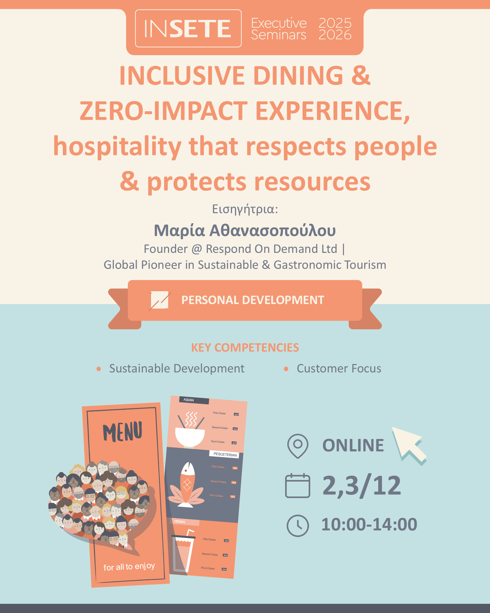 Ο επισκέπτης κουβαλά πίσω του πολιτισμούς, θρησκείες, αλλεργίες, ιδεολογίες. Το φαγητό δεν είναι μόνο “γεύση”, είναι και ταυτότητα. Το προσωπικό μαθαίνει να σέβεται τη διαφορετικότητα στο τραπέζι και να δημιουργεί αίσθηση ένταξης για όλους.