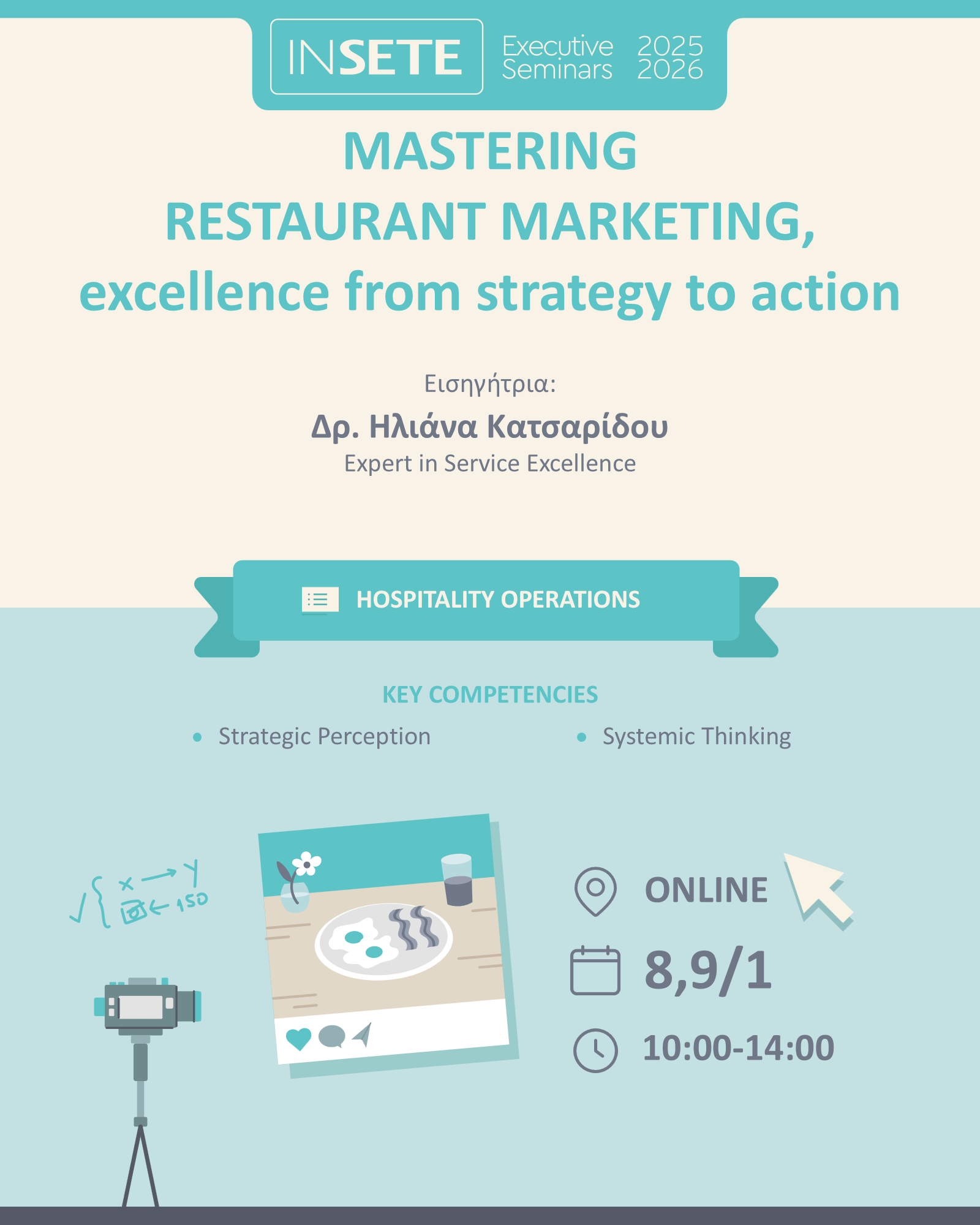 Το σεμινάριο προσφέρει μια ολοκληρωμένη και στοχευμένη εκπαίδευση που επικεντρώνεται στη στρατηγική και στις πρακτικές μάρκετινγκ στον κλάδο της εστίασης. Στόχος του σεμιναρίου είναι να αποκτήσουν οι συμμετέχοντες γνώσεις για τις τεχνικές, τα εργαλεία και τις προσεγγίσεις που επιτρέπουν σε μια επιχείρηση να διαμορφώσει μια αποτελεσματική παρουσία στην αγορά. Μέσα από πρακτικά παραδείγματα, οι συμμετέχοντες θα εξοικειωθούν με βέλτιστες πρακτικές που προάγουν την ανάπτυξη και τη διατήρηση μιας ανταγωνιστικής θέσης στον κλάδο, κατανοώντας σε βάθος τις παραμέτρους που πρέπει να διαχειριστούν για να προσφέρουν τη μέγιστη αξία στους πελάτες τους.
