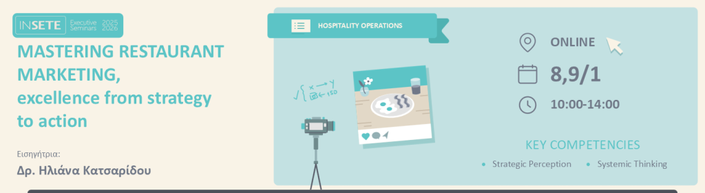 Το σεμινάριο προσφέρει μια ολοκληρωμένη και στοχευμένη εκπαίδευση που επικεντρώνεται στη στρατηγική και στις πρακτικές μάρκετινγκ στον κλάδο της εστίασης. Στόχος του σεμιναρίου είναι να αποκτήσουν οι συμμετέχοντες γνώσεις για τις τεχνικές, τα εργαλεία και τις προσεγγίσεις που επιτρέπουν σε μια επιχείρηση να διαμορφώσει μια αποτελεσματική παρουσία στην αγορά. Μέσα από πρακτικά παραδείγματα, οι συμμετέχοντες θα εξοικειωθούν με βέλτιστες πρακτικές που προάγουν την ανάπτυξη και τη διατήρηση μιας ανταγωνιστικής θέσης στον κλάδο, κατανοώντας σε βάθος τις παραμέτρους που πρέπει να διαχειριστούν για να προσφέρουν τη μέγιστη αξία στους πελάτες τους.
