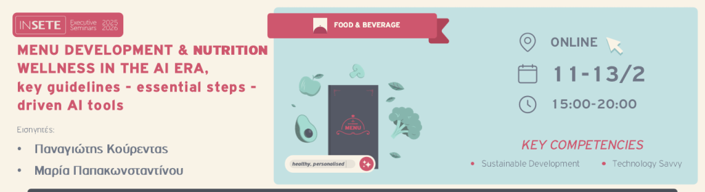 Το σεμινάριο “ MENU DEVELOPMENT & NUTRITION WELLNESS IN THE AI ERA, key guidelines – essential steps – driven AI tools” προσφέρει μια σύγχρονη, ολιστική προσέγγιση στη διαδικασία σχεδιασμού και ανάπτυξης μενού, εστιάζοντας στη διατροφική ευεξία και στη χρήση εργαλείων τεχνητής νοημοσύνης (AI) ως καταλύτη καινοτομίας.