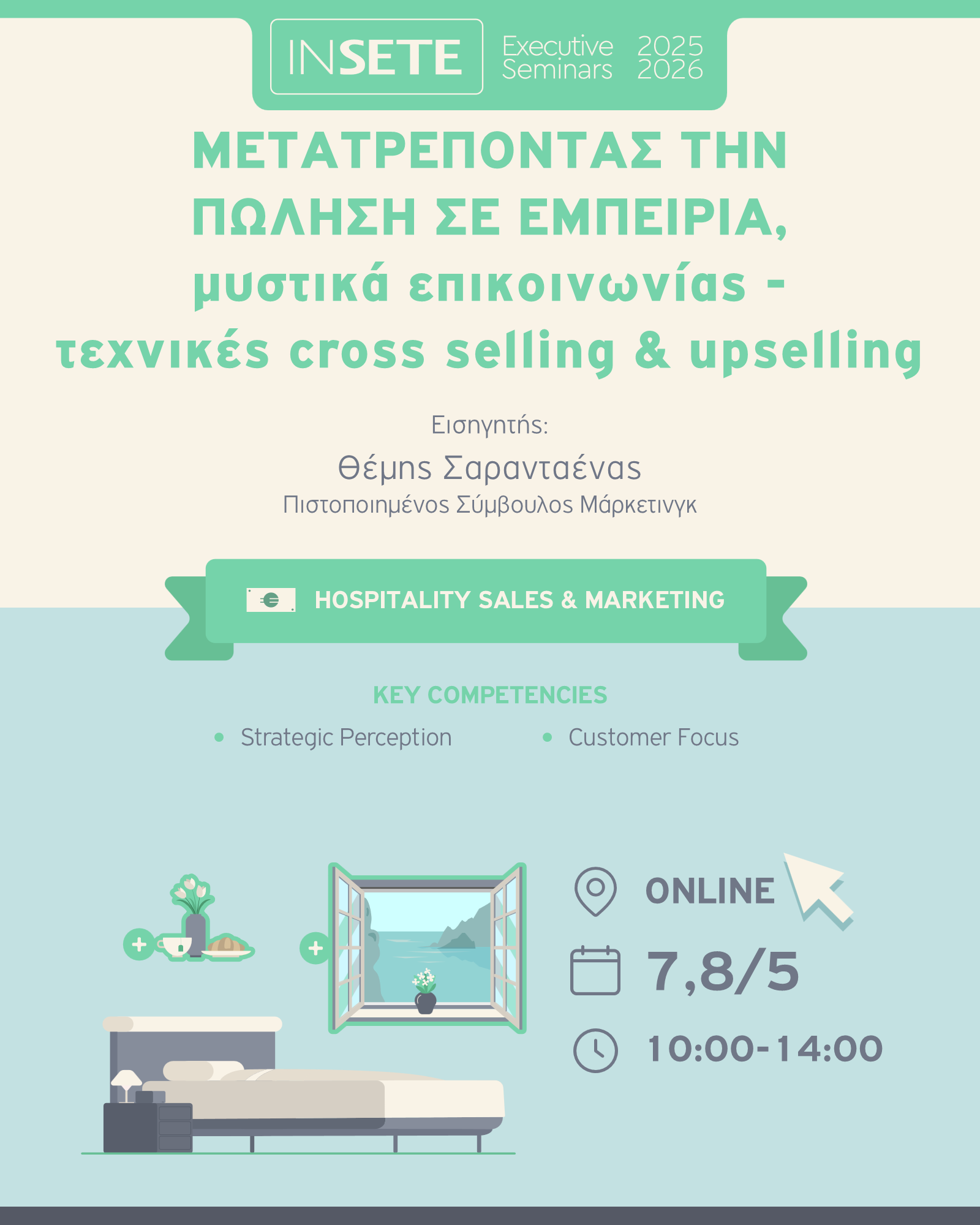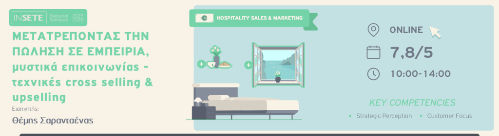 Παράλληλα, θα εξασκηθούμε στα 6 κρίσιμα βήματα της πώλησης, όπως εφαρμόζονται στον ξενοδοχειακό χώρο, και θα μάθουμε τεχνικές cross selling και upselling που ενισχύουν την εμπειρία του πελάτη και αυξάνουν τον μέσο όρο εσόδων ανά διαμονή.