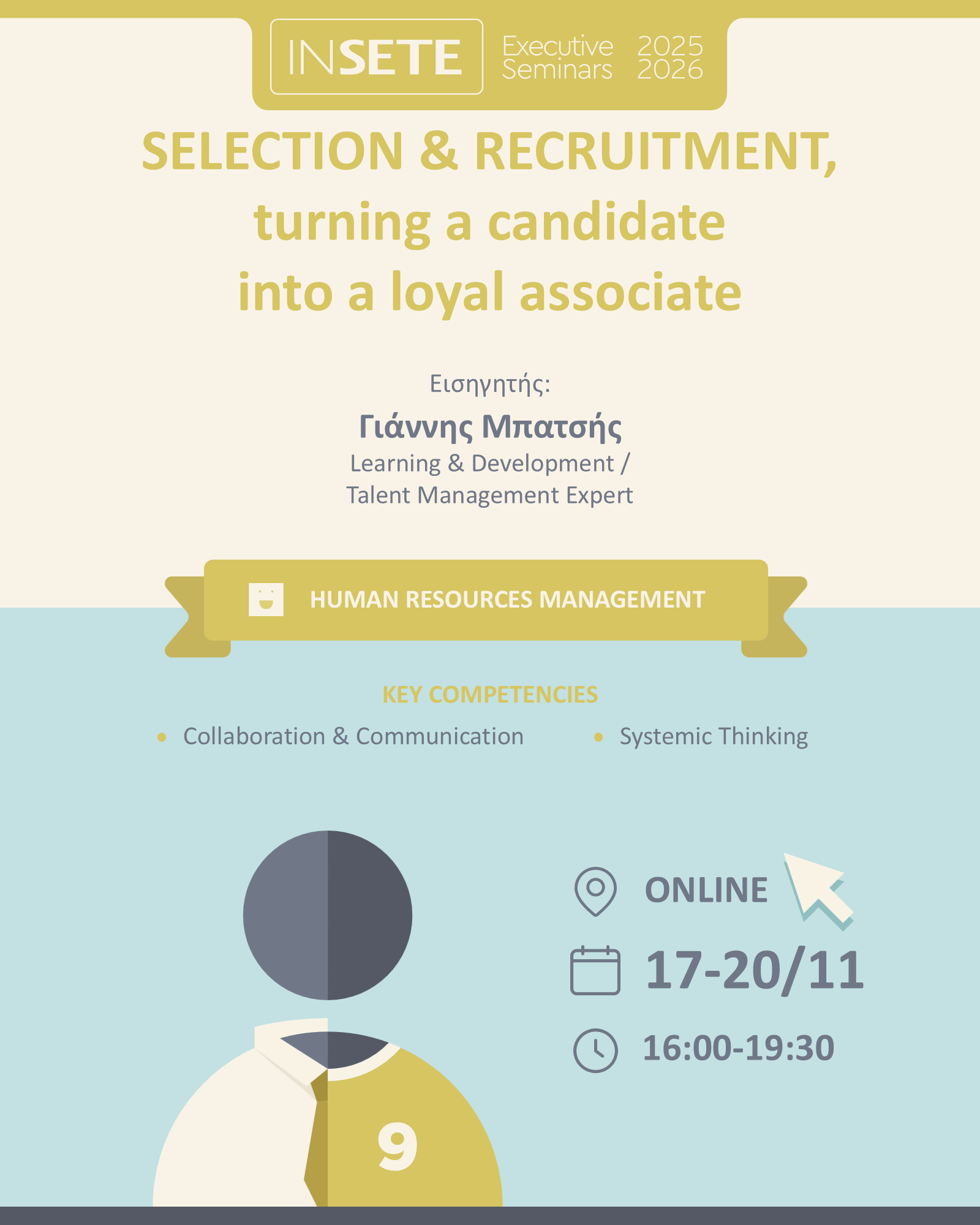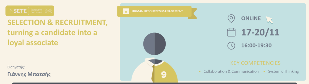 Η επιτυχία μιας επιχείρησης ξεκινά από την επιλογή των κατάλληλων ανθρώπων. Το σεμινάριο “Selection & Recruitment” σχεδιάστηκε για να προσφέρει σε στελέχη και επαγγελματίες τα εργαλεία, τις γνώσεις και τις δεξιότητες που απαιτούνται για μια αποτελεσματική και σύγχρονη διαδικασία πρόσληψης. Συνδυάζοντας θεωρία, βέλτιστες πρακτικές και βιωματικές ασκήσεις, το πρόγραμμα βοηθά τους συμμετέχοντες να ενισχύσουν την ικανότητά τους να προσελκύουν, να αξιολογούν και να επιλέγουν υποψηφίους με τρόπο επαγγελματικό, αντικειμενικό και ευθυγραμμισμένο με τις ανάγκες του οργανισμού. Εστιάζει όχι μόνο στο “πώς” γίνεται μια συνέντευξη, αλλά και στο “γιατί”, ενδυναμώνοντας τη στρατηγική σκέψη πίσω από κάθε επιλογή και αναδεικνύοντας τον ρόλο της εμπειρίας υποψηφίου (candidate experience) ως κρίσιμο παράγοντα για την εταιρική φήμη και τη διατήρηση ταλέντου.