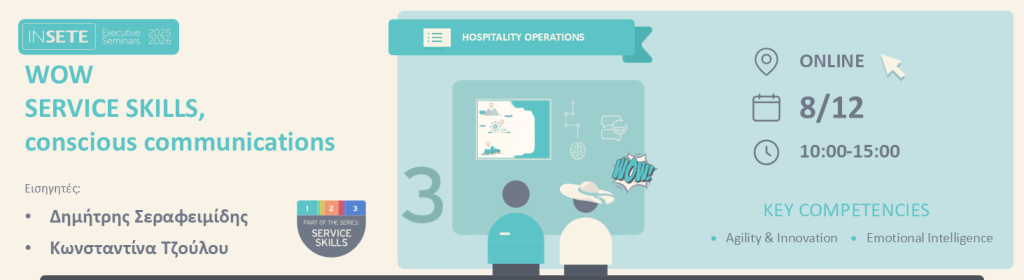 *Σημείωση: Στη σειρά των Executive Seminars WOW Service Skills θα γίνει εξάσκηση και ανάπτυξη δεξιοτήτων. Συστήνεται να έχετε συμμετάσχει στο παρελθόν σε σεμινάριο/-α με θεματολογίες Customer Service, Guest Experience, Complaint Handling.