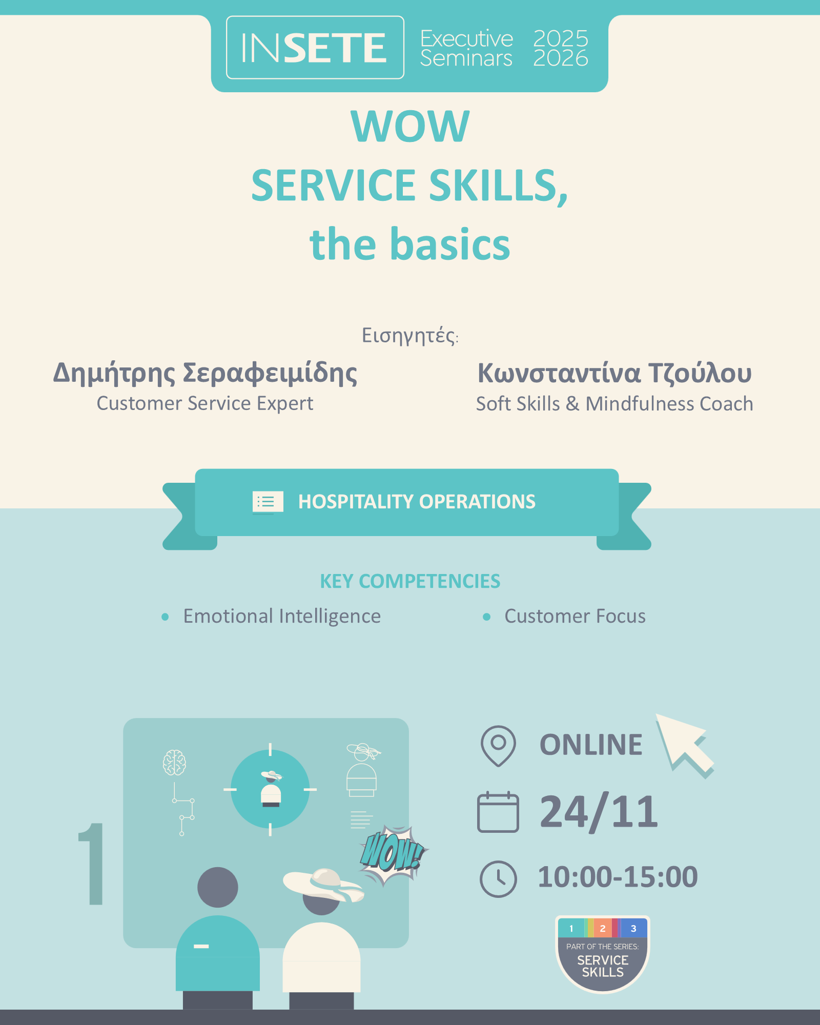 *Σημείωση: Στη σειρά των Executive Seminars WOW Service Skills θα γίνει εξάσκηση και ανάπτυξη δεξιοτήτων. Συστήνεται να έχετε συμμετάσχει στο παρελθόν σε σεμινάριο/-α με θεματολογίες Customer Service, Guest Experience, Complaint Handling.