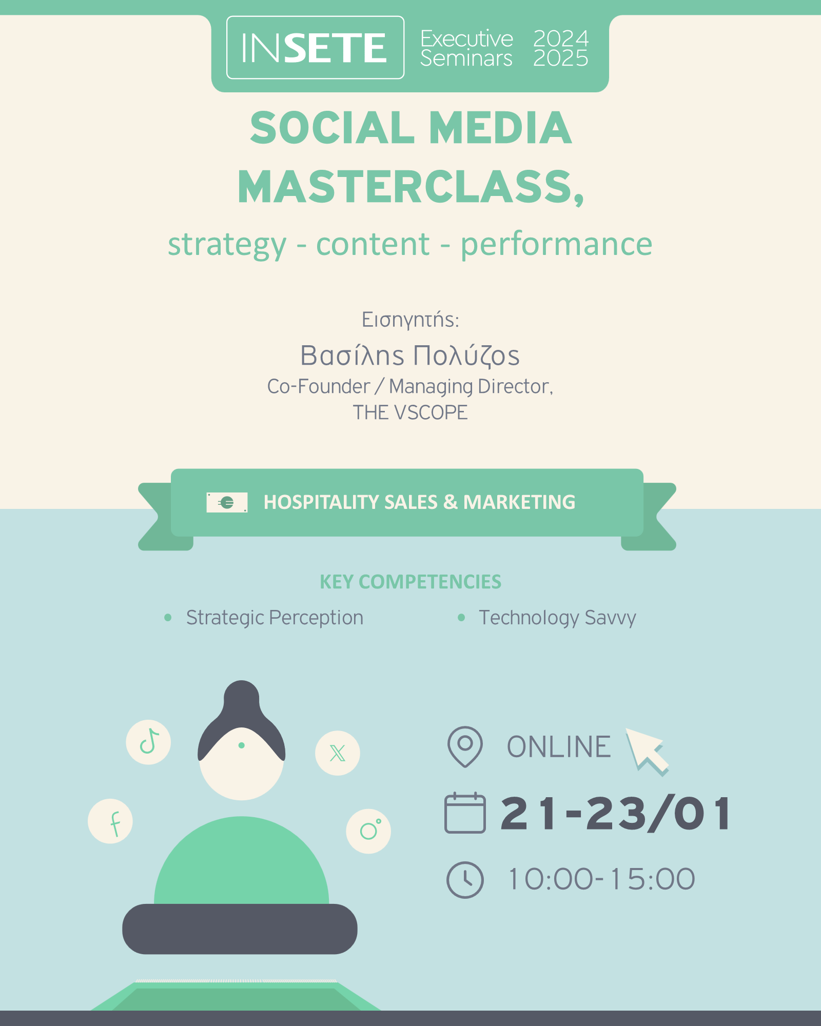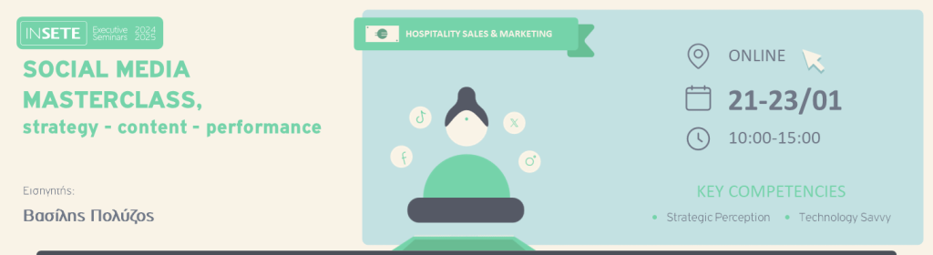 Το Social Media Masterclass, στοχεύει στο να δώσει στους συμμετέχοντες μία ολοκληρωμένη εικόνα, σε θεωρητικό και πρακτικό επίπεδο, για όλες τις απαιτούμενες ενέργειες στο συνεχώς μεταβαλλόμενο περιβάλλον των κοινωνικών δικτύων. Μέσω του webinar, οι συμμετέχοντες θα είναι σε θέση να χτίσουν τη στρατηγική τους στα Social Media, να δημιουργήσουν περιεχόμενο για την επιχείρησή τους στα πιο δημοφιλή networks (FB, Instagram, TikTok) καθώς επίσης και να αναπτύξουν και να βελτιώσουν τις Paid Campaigns τους μέσα από τον Ad Manager της Meta.