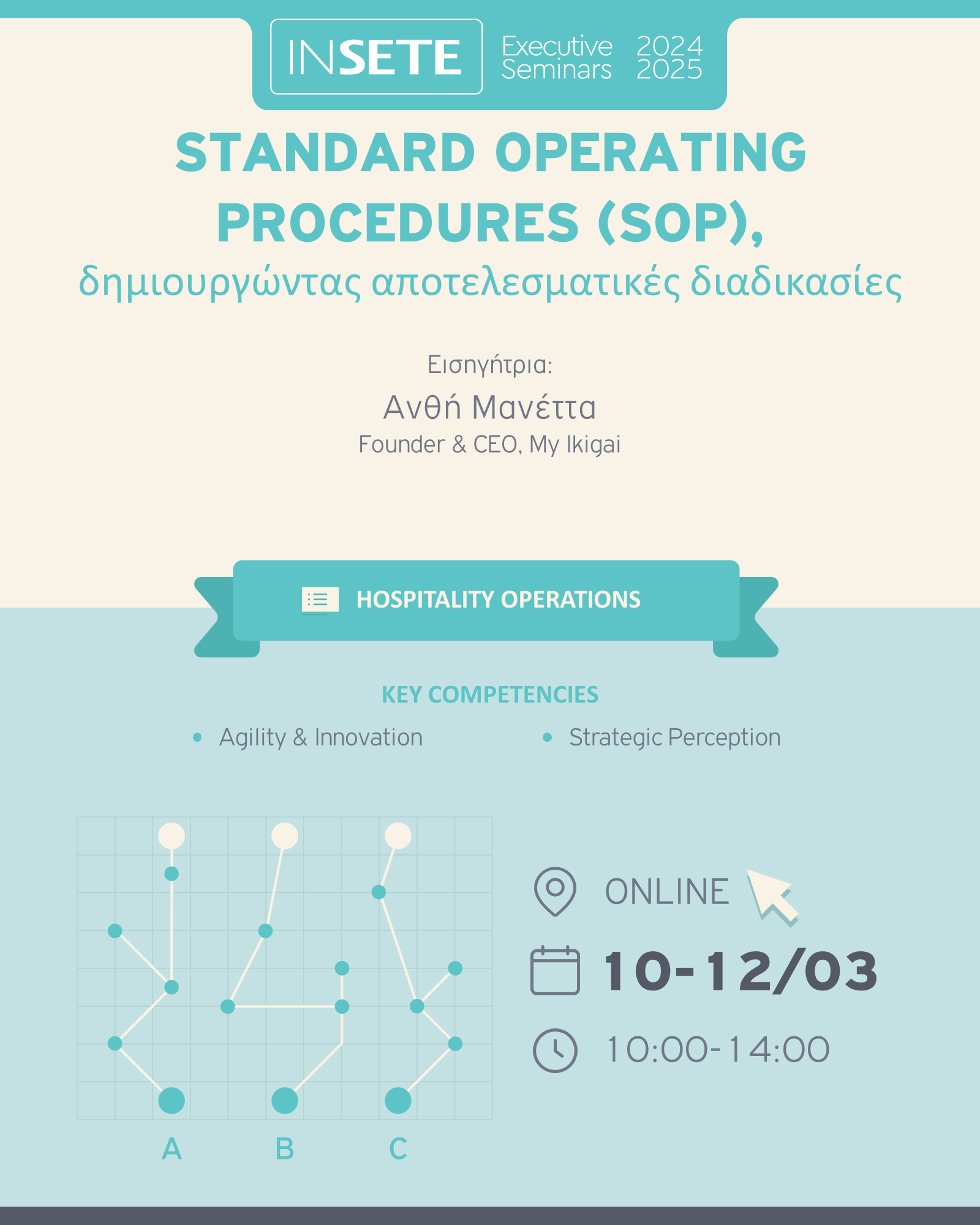 Η Ανθή Μανέτα υπηρετεί τον κλάδο της Φιλοξενίας εδώ και περισσότερα από 15 χρόνια, με εμπειρία τόσο σε εκτελεστικές όσο και σε επιτελικές θέσεις σε ξενοδοχεία 5 αστέρων. Επιπλέον, έχει εκτεταμένη εμπειρία σε ανοίγματα ξενοδοχείων και στην ενδυνάμωση ομάδων, μέσα από τους ρόλους της ως Διευθύντρια Ξενοδοχείων και Διευθύντρια Ανθρώπινου Δυναμικού σε γνωστούς ξενοδοχειακούς ομίλους. Είναι πτυχιούχος του Τμήματος Διοίκησης Επιχειρήσεων του Πανεπιστημίου Πατρών και κάτοχος μεταπτυχιακού τίτλου σπουδών στη Διοίκηση Υπηρεσιών του Οικονομικού Πανεπιστημίου Αθηνών. Είναι πιστοποιημένη στη Διαχείριση Ανθρώπινου Δυναμικού από το Πανεπιστήμιο Cornell και στη Μεθοδολογία Lean Six Sigma από το Καποδιστριακό Πανεπιστήμιο Αθηνών. Τέλος, είναι η δημιουργός και CEO της My Ikigai, εταιρείας που εξειδικεύεται στην Στρατηγική Ανθρώπινου Δυναμικού και Εσωτερικής Λειτουργίας σε Ξενοδοχεία, παρέχοντας ολοκληρωμένες λύσεις και στρατηγικό σχεδιασμό είτε σε επίπεδο outsourcing είτε σε επίπεδο consulting.