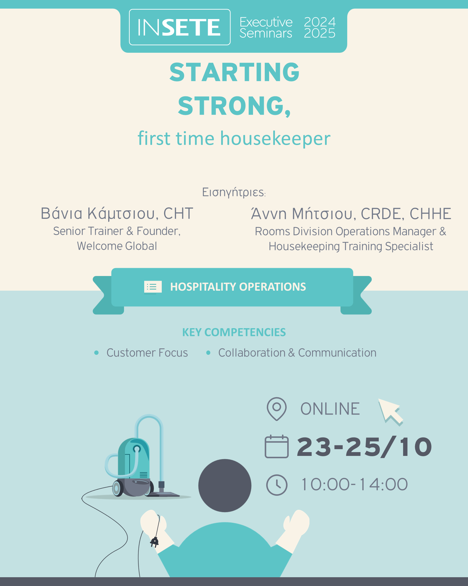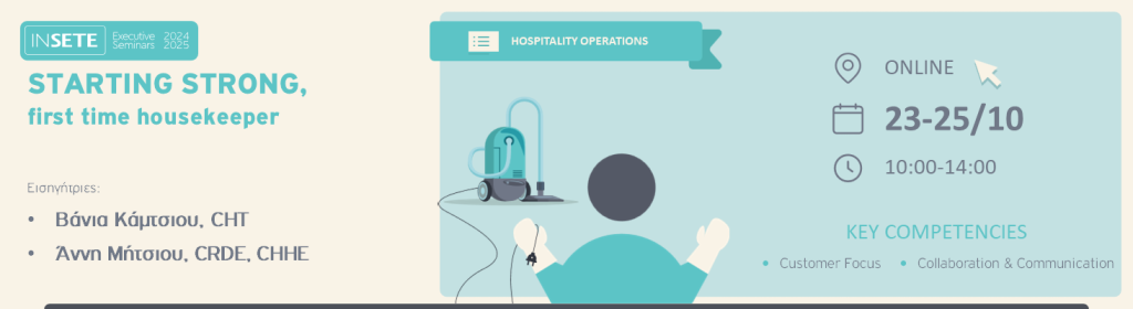 Το συγκεκριμένο Executive Seminar παρουσιάζει με πρακτικό τρόπο τα ζητούμενα του ρόλου του/της Housekeeper και δίνει εργαλεία και γνώσεις για τη σωστή οργάνωση του τμήματος και τον καθημερινό τρόπο οργάνωσης και λειτουργίας. To περιεχόμενο του σεμιναρίου, στοχεύει στην ενίσχυση της αυτοπεποίθησης των ατόμων που θα εργαστούν για πρώτη φορά ως Housekeepers και θα συνεισφέρουν άμεσα στην επιτυχία. Για την κατάρτισή σας, σας προτείνουμε επίσης την παρακολούθηση του Executive Seminar «HOUSEKEEPING MANAGEMENT 1, Operations & Leadership», για να ενισχύσετε τις γνώσεις σας με θέματα operations και ηγεσίας καθώς επίσης και το Εxecutive Seminar «FRESH & TIDYEssentials for Laundry and Linen Room Efficiency» για να καλύψετε το κομμάτι των πλυντηρίων και της λινοθήκης.