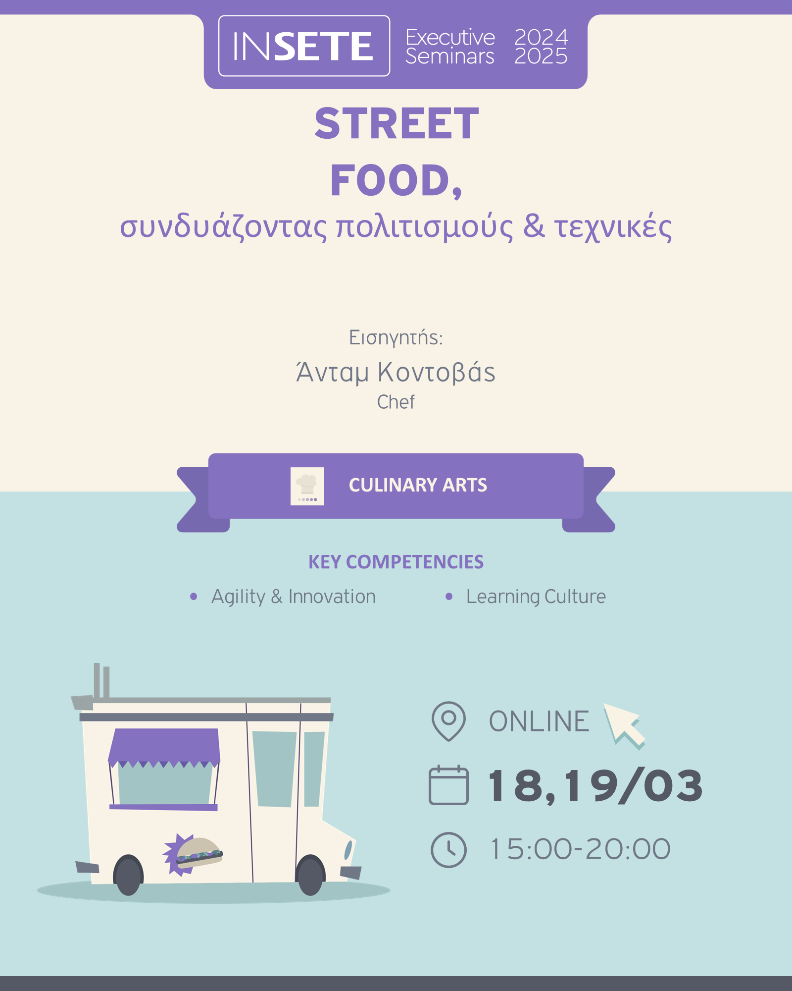 Στις 18 και 19 Μαρτίου 2025, το ΙΝΣΕΤΕ και η Gastronomy Essentials σας προσκαλούν σε ένα μοναδικό διήμερο online webinar αφιερωμένο στον κόσμο του street food. Με εισηγητή τον chef Άνταμ Κοντοβά, το πρόγραμμα προσφέρει μια καινοτόμο προσέγγιση που συνδυάζει τη γαστρονομική παράδοση με τις σύγχρονες τάσεις και τεχνικές.