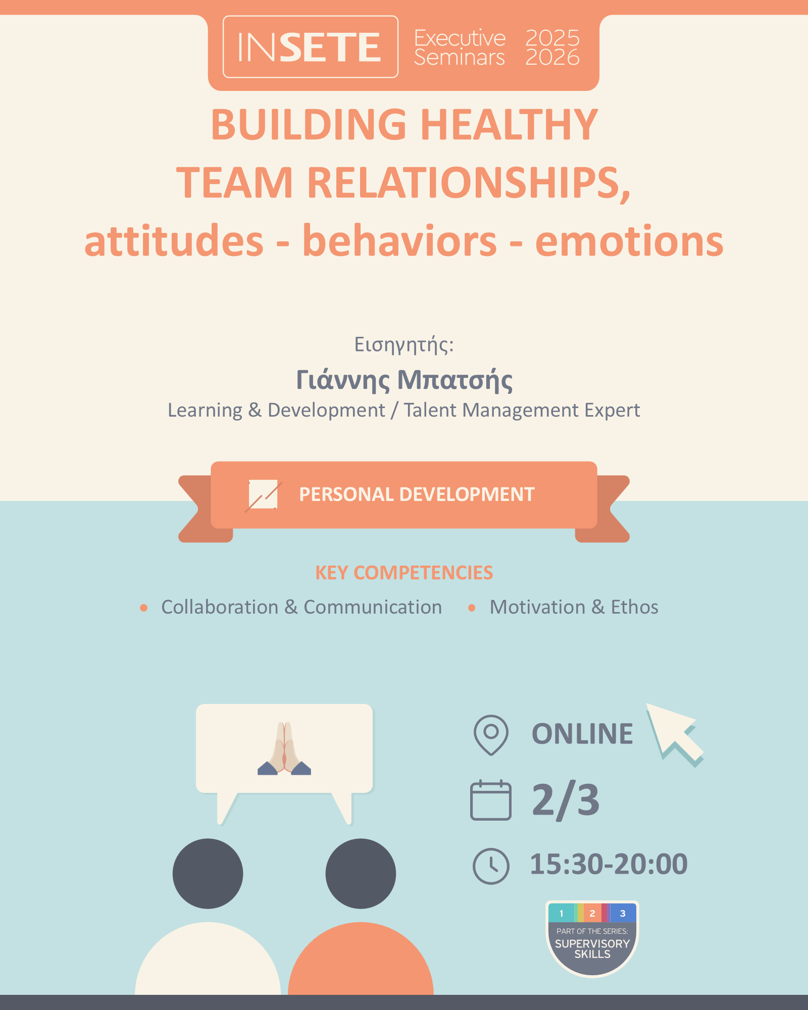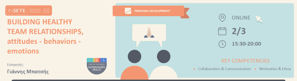 Σε έναν κόσμο όπου οι ομάδες ζητούν περισσότερο καθοδήγηση και λιγότερο έλεγχο, οι ηγέτες χρειάζονται περισσότερα από τεχνικές δεξιότητες. Χρειάζονται ανθρώπινες δεξιότητες. Το “SUPERVISORY SKILLS” είναι ένα δυναμικό πρόγραμμα που αναπτύσσει τις πιο κρίσιμες δεξιότητες για όσους ηγούνται ανθρώπων: πώς να χτίζεις εμπιστοσύνη, να επικοινωνείς ξεκάθαρα, να εμπνέεις και να οδηγείς μέσα από την αλλαγή.