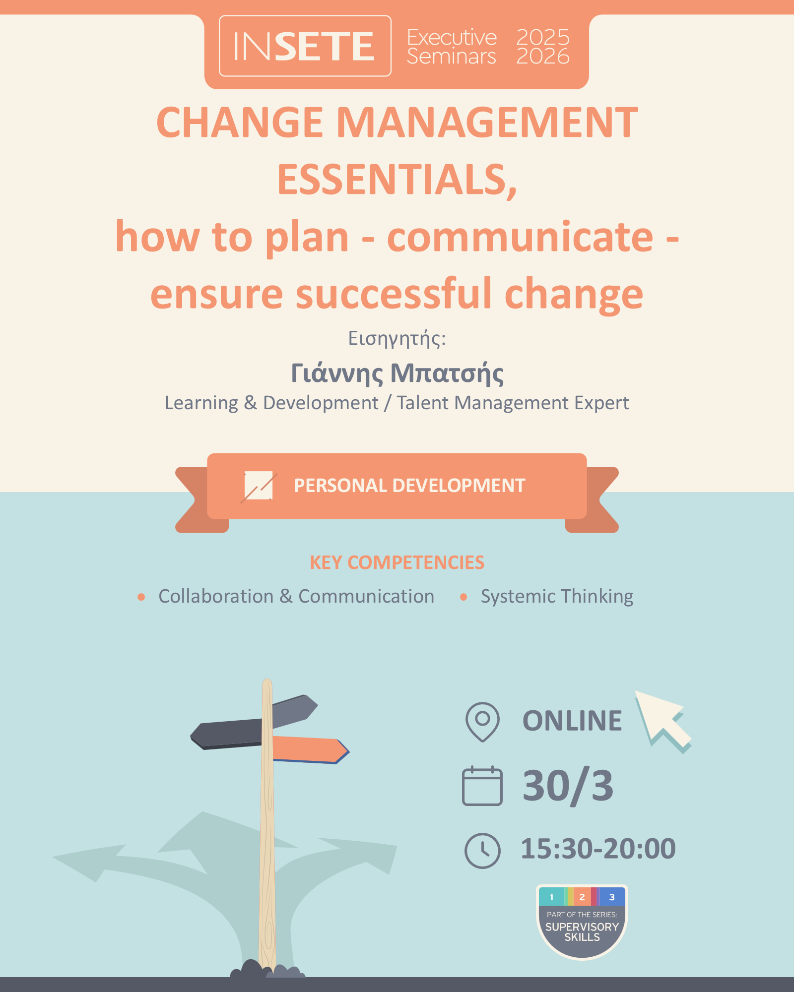Σε έναν κόσμο όπου οι ομάδες ζητούν περισσότερο καθοδήγηση και λιγότερο έλεγχο, οι ηγέτες χρειάζονται περισσότερα από τεχνικές δεξιότητες. Χρειάζονται ανθρώπινες δεξιότητες. Το “SUPERVISORY SKILLS” είναι ένα δυναμικό πρόγραμμα που αναπτύσσει τις πιο κρίσιμες δεξιότητες για όσους ηγούνται ανθρώπων: πώς να χτίζεις εμπιστοσύνη, να επικοινωνείς ξεκάθαρα, να εμπνέεις και να οδηγείς μέσα από την αλλαγή.