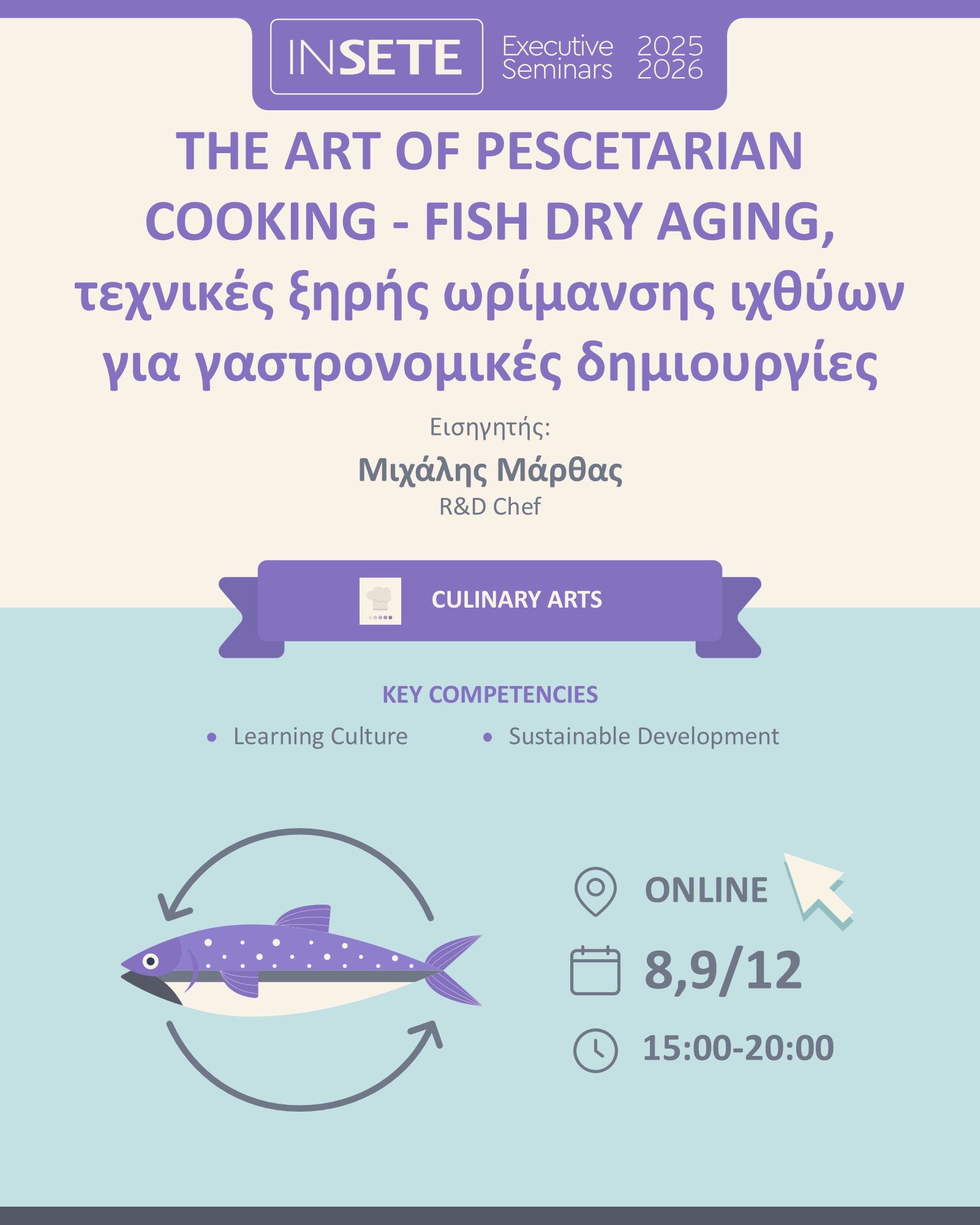 Στην εκπαίδευση PESCETARIAN & FISH DRY AGING, ο Chef Μιχάλης Μάρθας θα μας εισάγει στις σύγχρονες τεχνικές ξηρής ωρίμανσης ψαριών και θαλασσινών, που αναβαθμίζουν την υφή και τη γεύση των προϊόντων. Η μέθοδος αυτή, καινοτόμος και συνεχώς αναπτυσσόμενη στη γαστρονομία, προσφέρει πλούσιες γεύσεις και απαλή υφή.