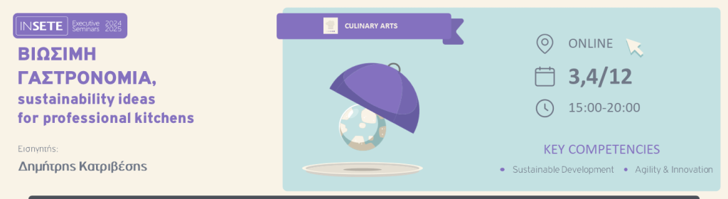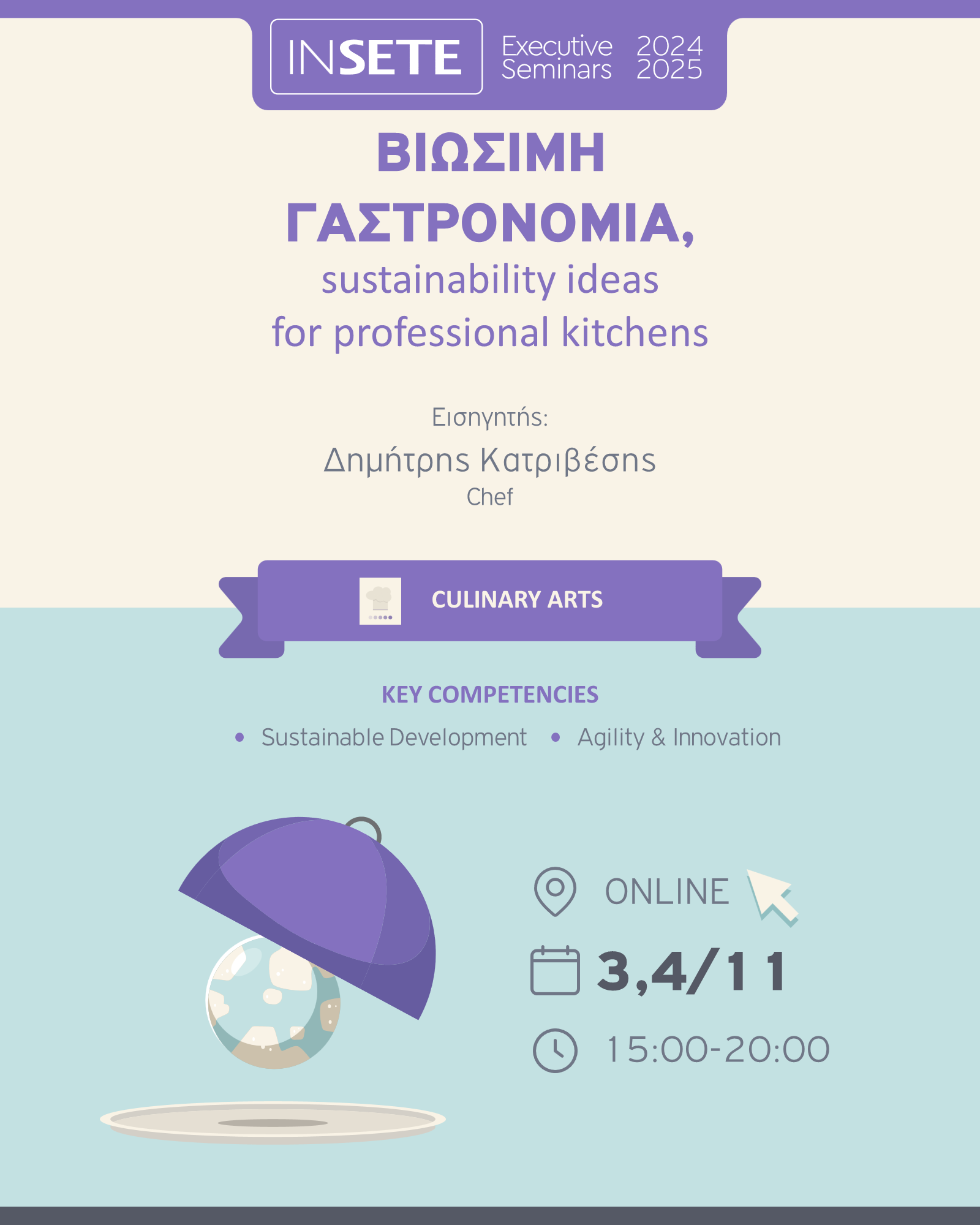 Ένα εκπαιδευτικό πρόγραμμα σχεδιασμένο ειδικά για επαγγελματίες σεφ που επιθυμούν να ενσωματώσουν βιώσιμες πρακτικές στις επιχειρήσεις τους. Σε αυτό το σεμινάριο, οι συμμετέχοντες θα εξερευνήσουν τη σημασία της βιωσιμότητας στη γαστρονομία και θα μάθουν πρακτικές τεχνικές και ιδέες για την εφαρμογή της στις επαγγελματικές κουζίνες τους. Επίσης, θα αποκτήσουν γνώσεις και εργαλεία για τη μείωση των αποβλήτων, την αειφόρο χρήση πρώτων υλών, την υποστήριξη τοπικών παραγωγών και πολλά άλλα. Ένα εκπαιδευτικό πρόγραμμα που θα αποτελέσει έμπνευση για τη δημιουργία μιας πιο βιώσιμης και αποτελεσματικής κουζίνα για το μέλλον.