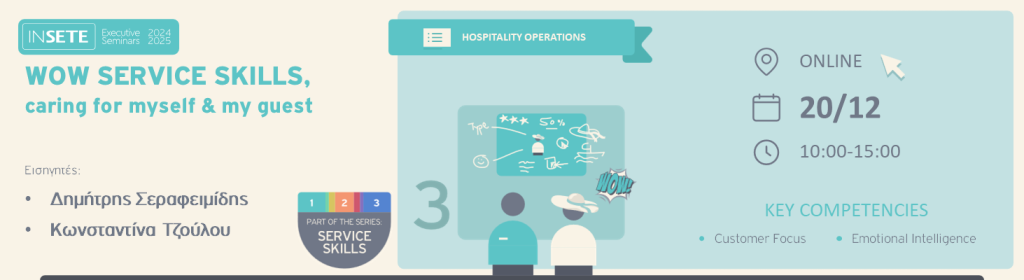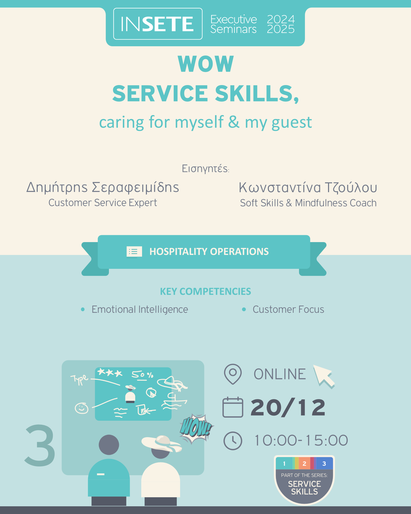*Σημείωση: Στη σειρά των Executive Seminars WOW Service Skills θα γίνει εξάσκηση και ανάπτυξη δεξιοτήτων. Συστήνεται να έχετε συμμετάσχει στο παρελθόν σε σεμινάριο/-α με θεματολογίες Customer Service, Guest Experience, Complaint Handling.